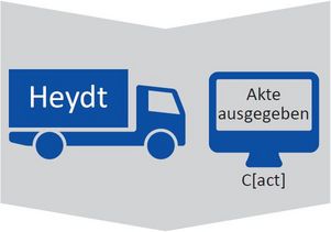 Vollständige- oder Teilakten werden über C[act] in Heydt Transportkisten gebucht und vom datenschutzgerechten Heydt Transportservice abgeholt - der Status in C[act] heißt "ausgegeben an Heydt". Das Servicelevel der Abholungen ist individuell bestimmbar.